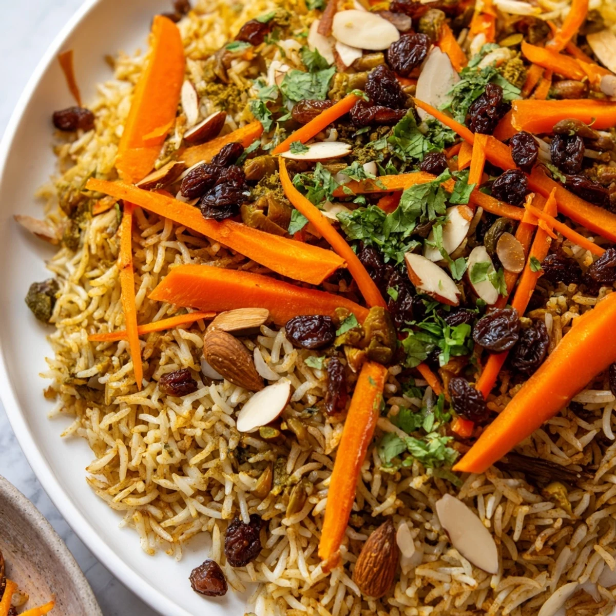 This aromatic Afghan rice transforms simple basmati into something extraordinary. The grains are first toasted in fragrant whole spices—cardamom pods, cinnamon sticks, cumin seeds, and cloves—before being simmered to fluffy perfection. While the rice cooks, julienned carrots become tender in buttery oil, then sweet raisins and toasted almonds join the pan, plumping beautifully. Everything gets gently folded together, then left to rest so the spices can fully permeate every grain. The result is a stunning dish that balances warming spice notes with natural sweetness, perfect alongside roasted lamb, spiced chicken, or enjoyed on its own as a satisfying vegetarian main.