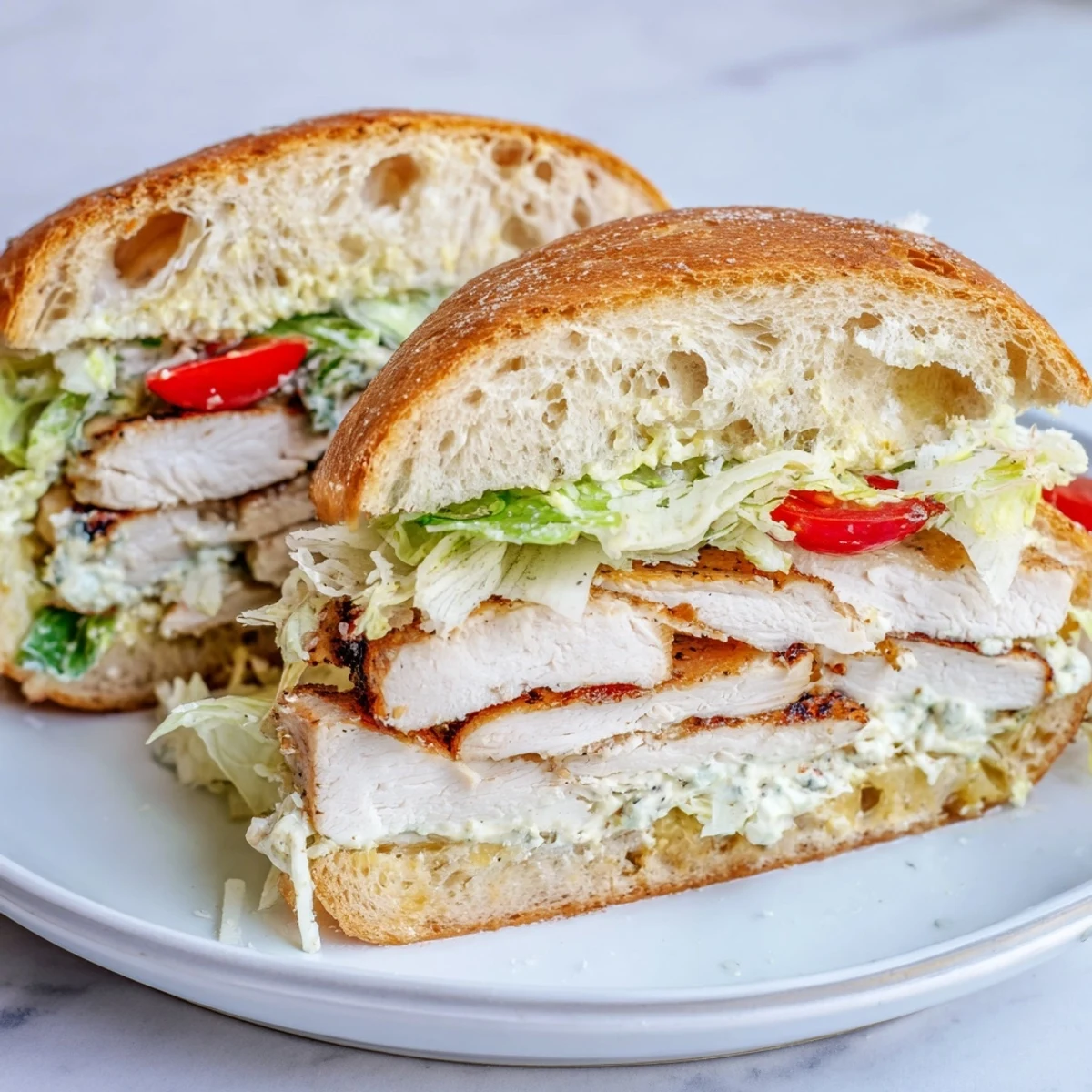 This satisfying sandwich transforms the beloved Caesar salad into a portable handheld meal. Grilled chicken breasts are seasoned simply and cooked until juicy, then layered with crisp shredded romaine, shaved Parmesan, and a tangy homemade Caesar dressing on golden-toasted ciabatta rolls.