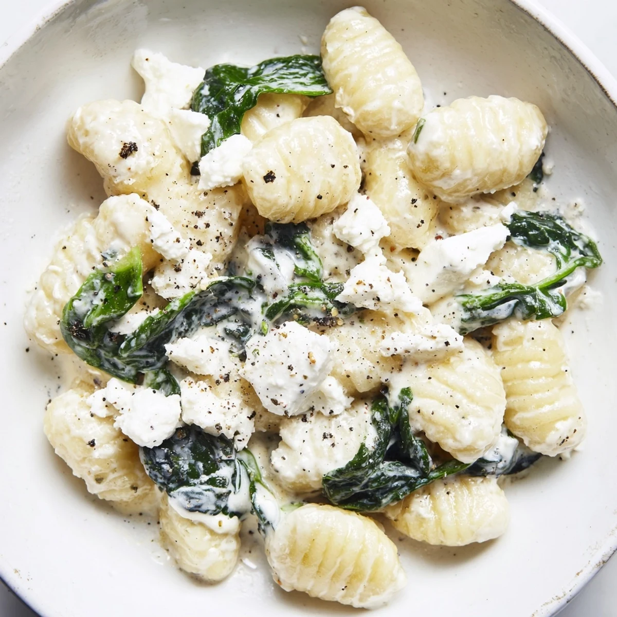 This comforting Italian-inspired dish features tender potato gnocchi coated in a luxurious creamy sauce enriched with wilted fresh spinach and tangy crumbled feta. Ready in just 25 minutes, this vegetarian main comes together quickly for weeknight dinners. The sauce combines heavy cream, butter, and Parmesan for richness, while a pinch of nutmeg adds warmth. Perfect for serving 4 people, this dish delivers satisfying comfort with minimal effort.