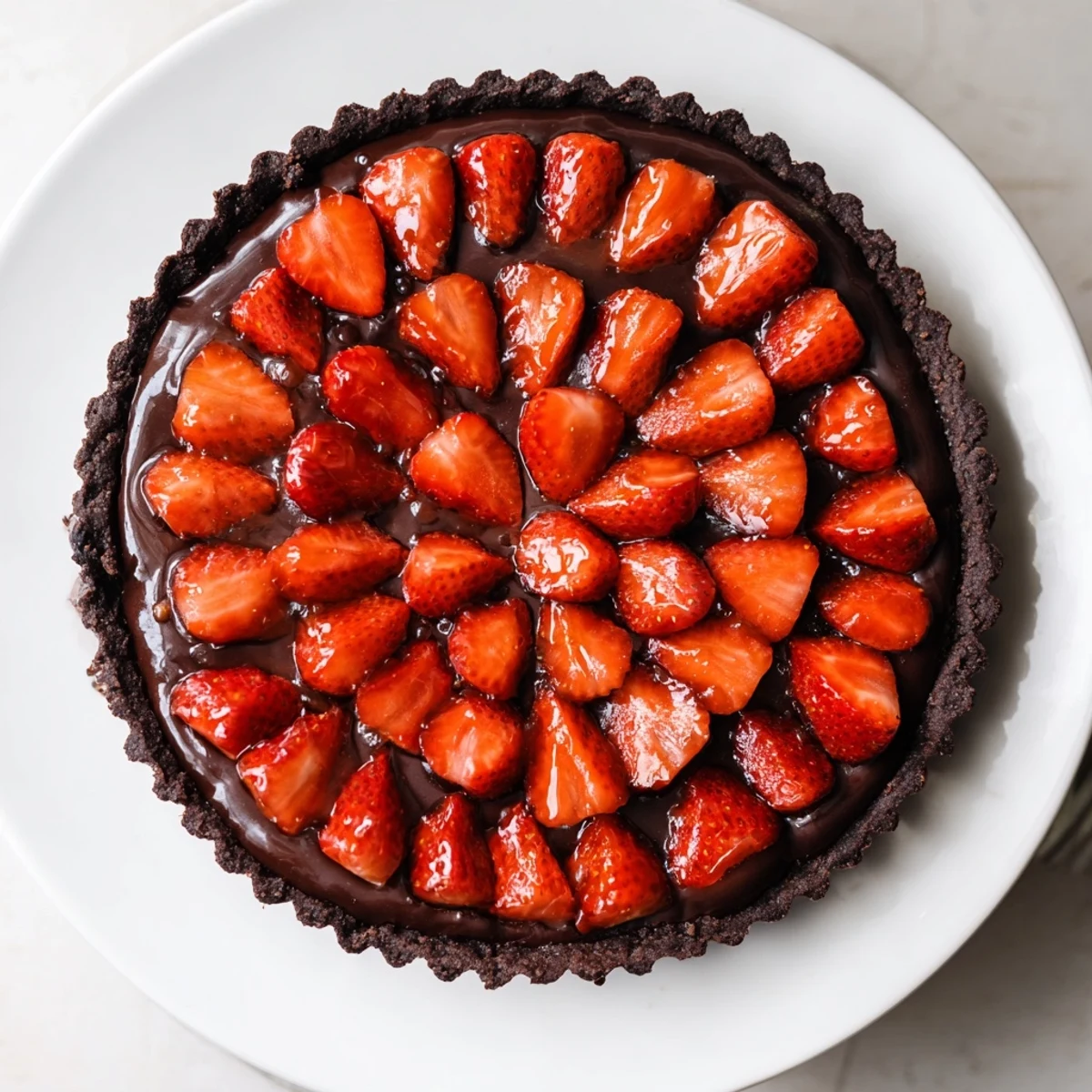 This dark chocolate strawberry tart pairs a crisp cocoa pastry shell with a glossy dark chocolate ganache and a crown of halved fresh strawberries. Blind-bake the crust until firm, pour warm ganache, then chill until set before arranging fruit for a clean finish.