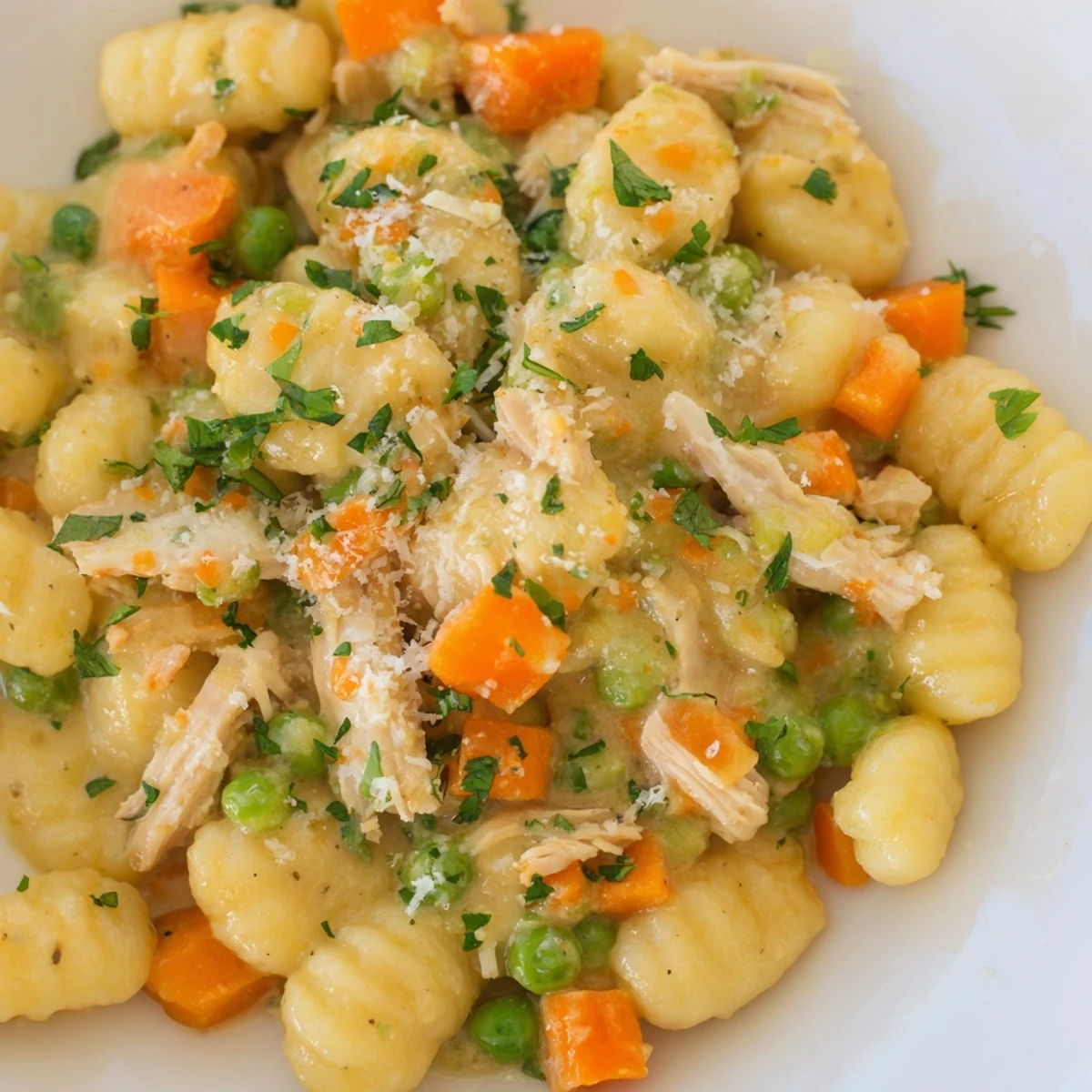 This hearty skillet dish combines pillowy potato gnocchi with tender shredded chicken and classic vegetables like carrots, celery, and peas. The creamy sauce gets its rich flavor from butter, herbs, and Parmesan, while the one-pot cooking method means everything simmers together in under an hour.