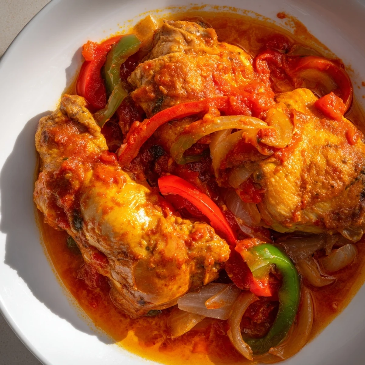 This vibrant Senegalese-style chicken dish features succulent meat simmered slowly in a rich tomato-based sauce. The aromatic blend includes onions, bell peppers, garlic, ginger, and traditional spices like thyme and paprika, creating layers of flavor that develop beautifully during cooking. After marinating the chicken in lemon and spices, it's browned to perfection before being returned to the pot to simmer gently in the sauce until tender. The result is tender, flavorful chicken in a thickened, savory sauce that pairs wonderfully with fluffy white rice or couscous.