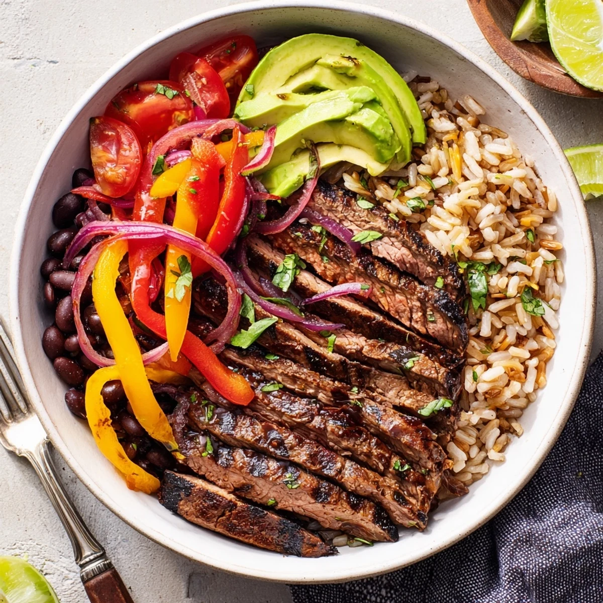 This bowl layers marinated flank steak with quickly sautéed red, yellow and green peppers and sweet red onion over warm brown rice or quinoa and seasoned black beans. Finish with sliced avocado, halved cherry tomatoes, shredded cheese, chopped cilantro and lime wedges plus a dollop of Greek yogurt. Marinate briefly for bright flavor, sear hot for caramelized edges, and swap cauliflower rice or grill the steak for variation.