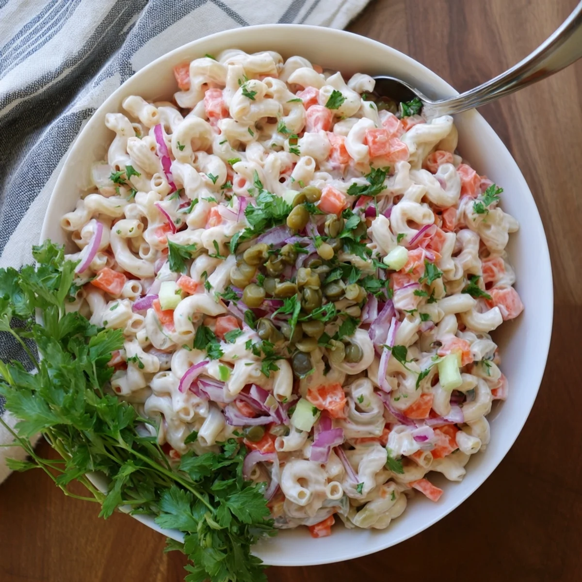 This American-style side dish combines tender elbow macaroni with crisp celery, red bell pepper, red onion, and shredded carrots. The velvety dressing blends mayonnaise, sour cream, Dijon mustard, and apple cider vinegar for that signature tangy flavor. Ready in just 30 minutes, it's an ideal make-ahead dish for summer gatherings.